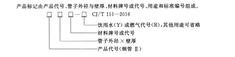 產(chǎn)品標(biāo)記由產(chǎn)品代號(hào)、管子外徑與壁厚、材料牌號(hào)或代號(hào)、用途和標(biāo)準(zhǔn)編號(hào)組成。標(biāo)記格式:鋼管 ID 管子外徑 × 壁厚 材料牌號(hào)或代號(hào)(用途) CJ/T 151-2016